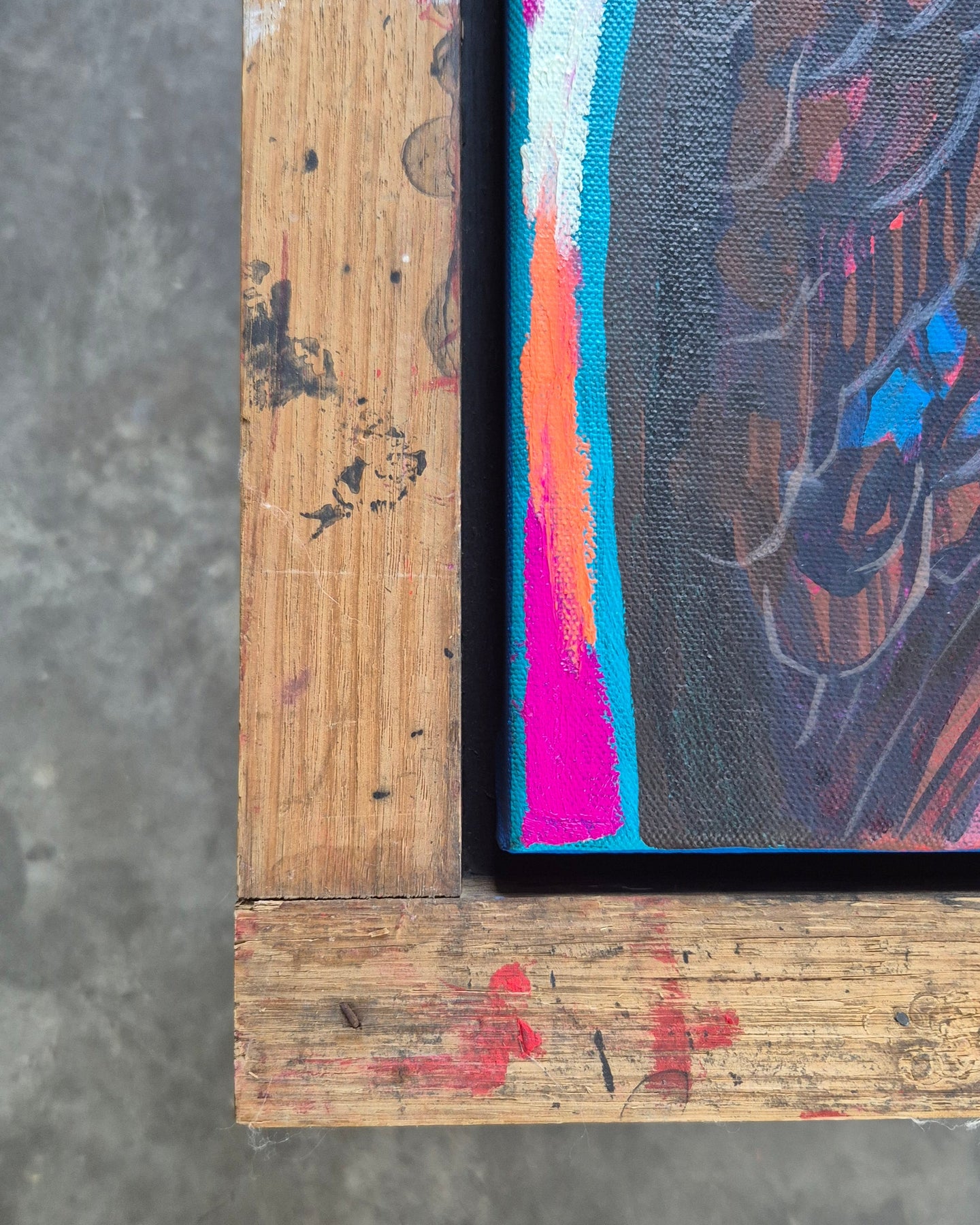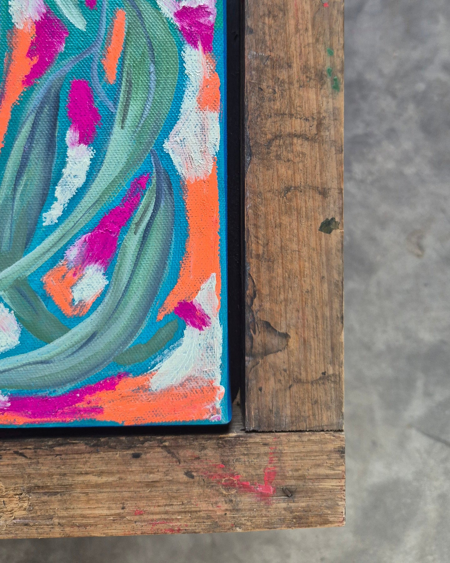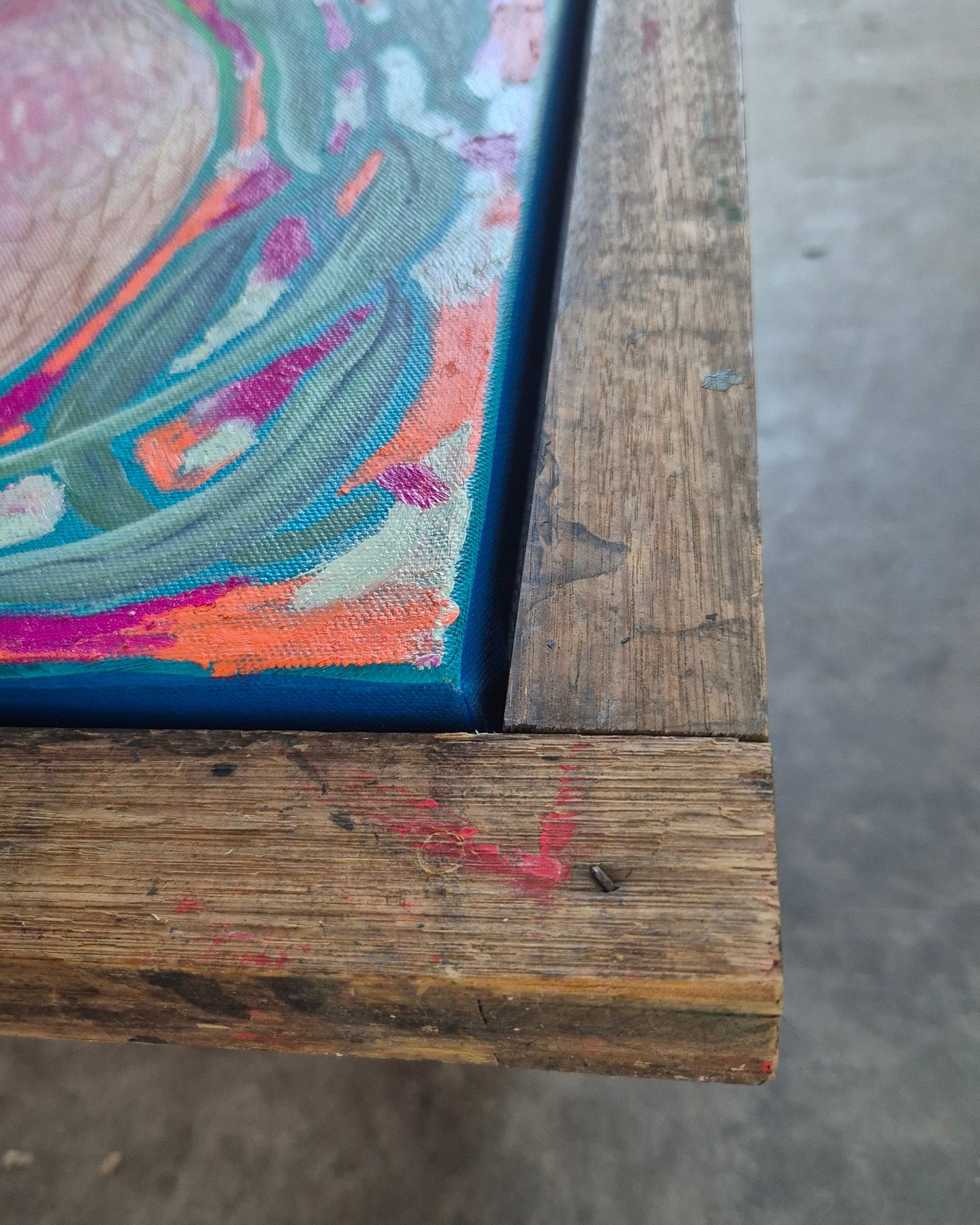 Acrylic and oil stick on cotton canvas, framed in a vintage screen print frame - ready to hang, d-rings.