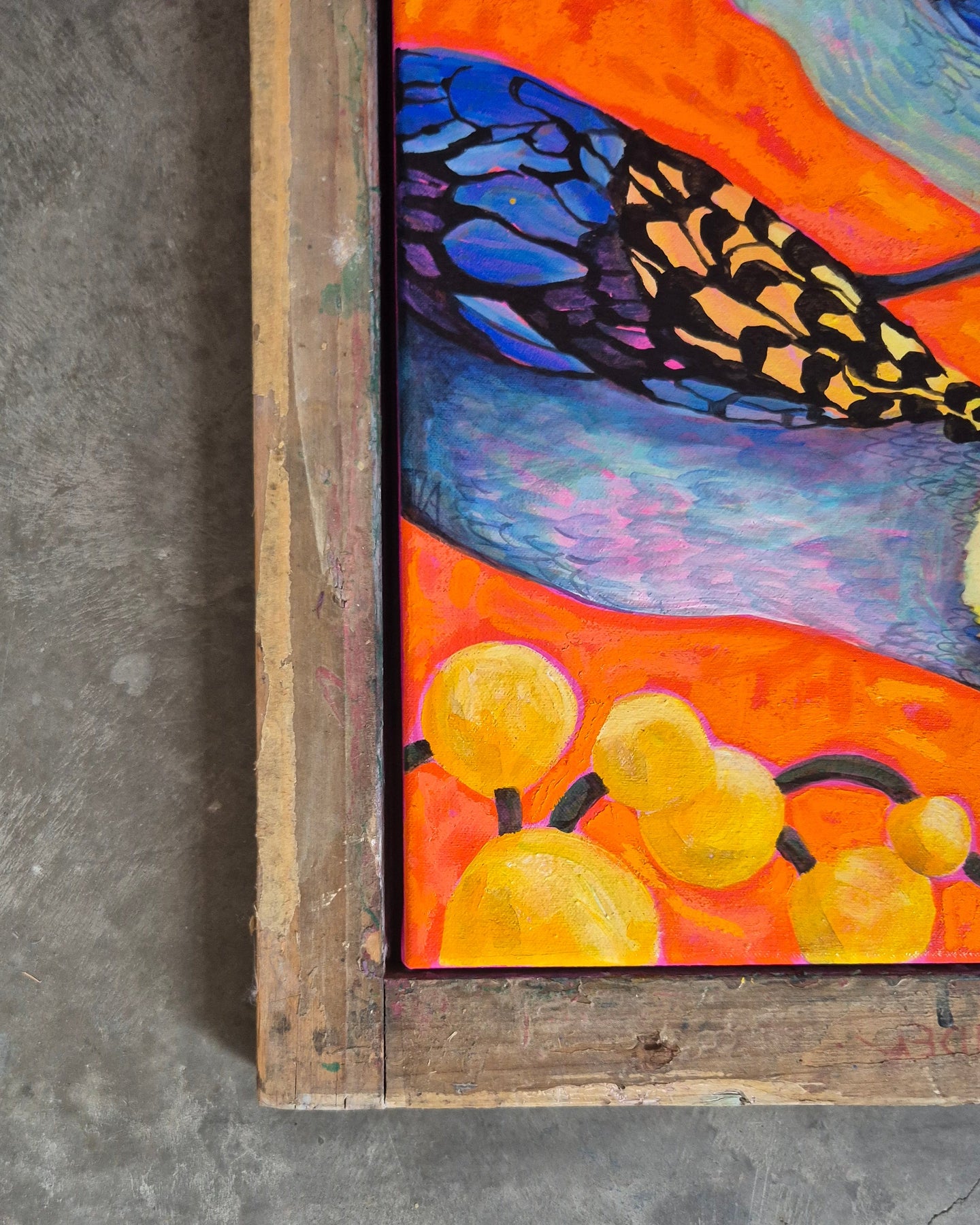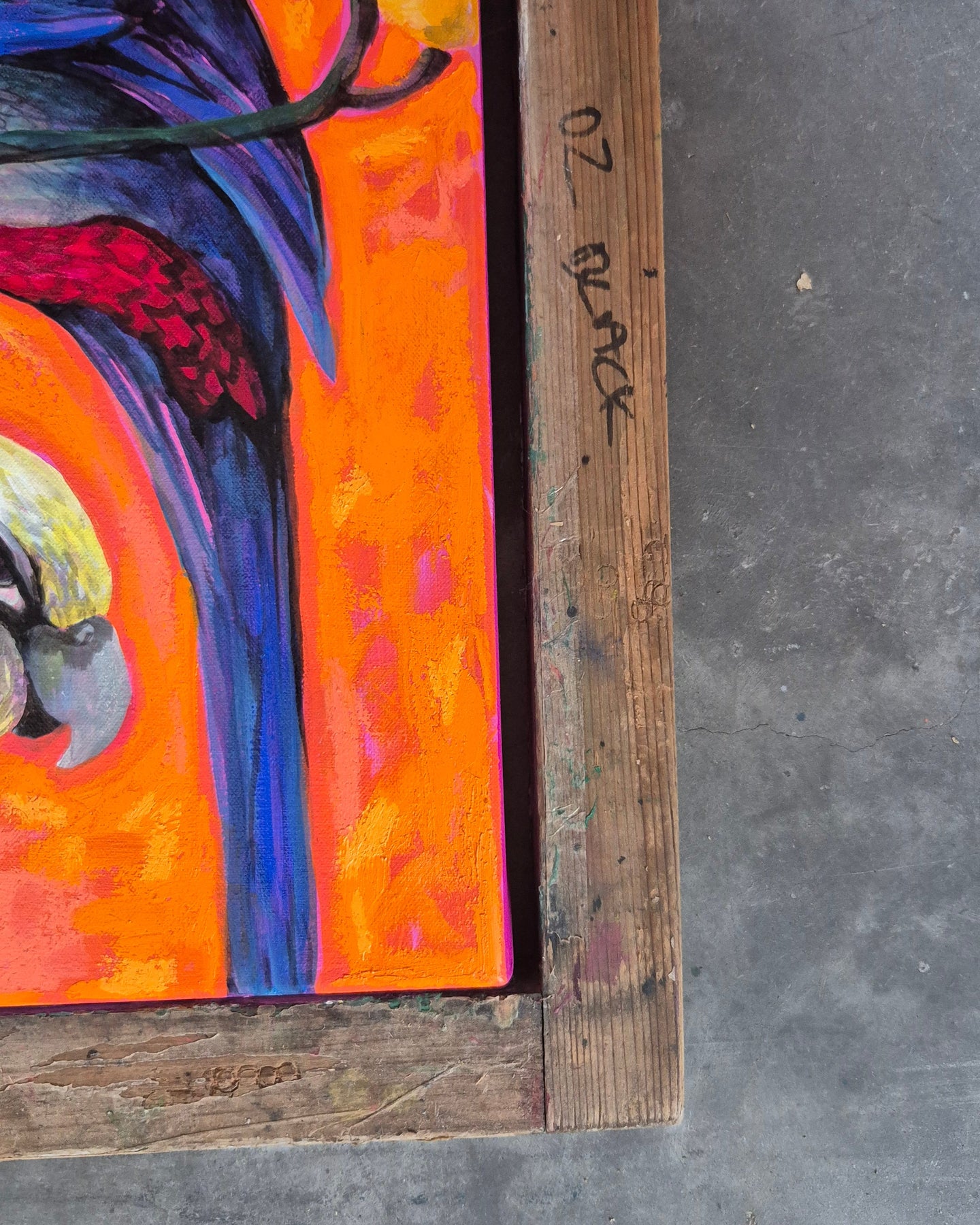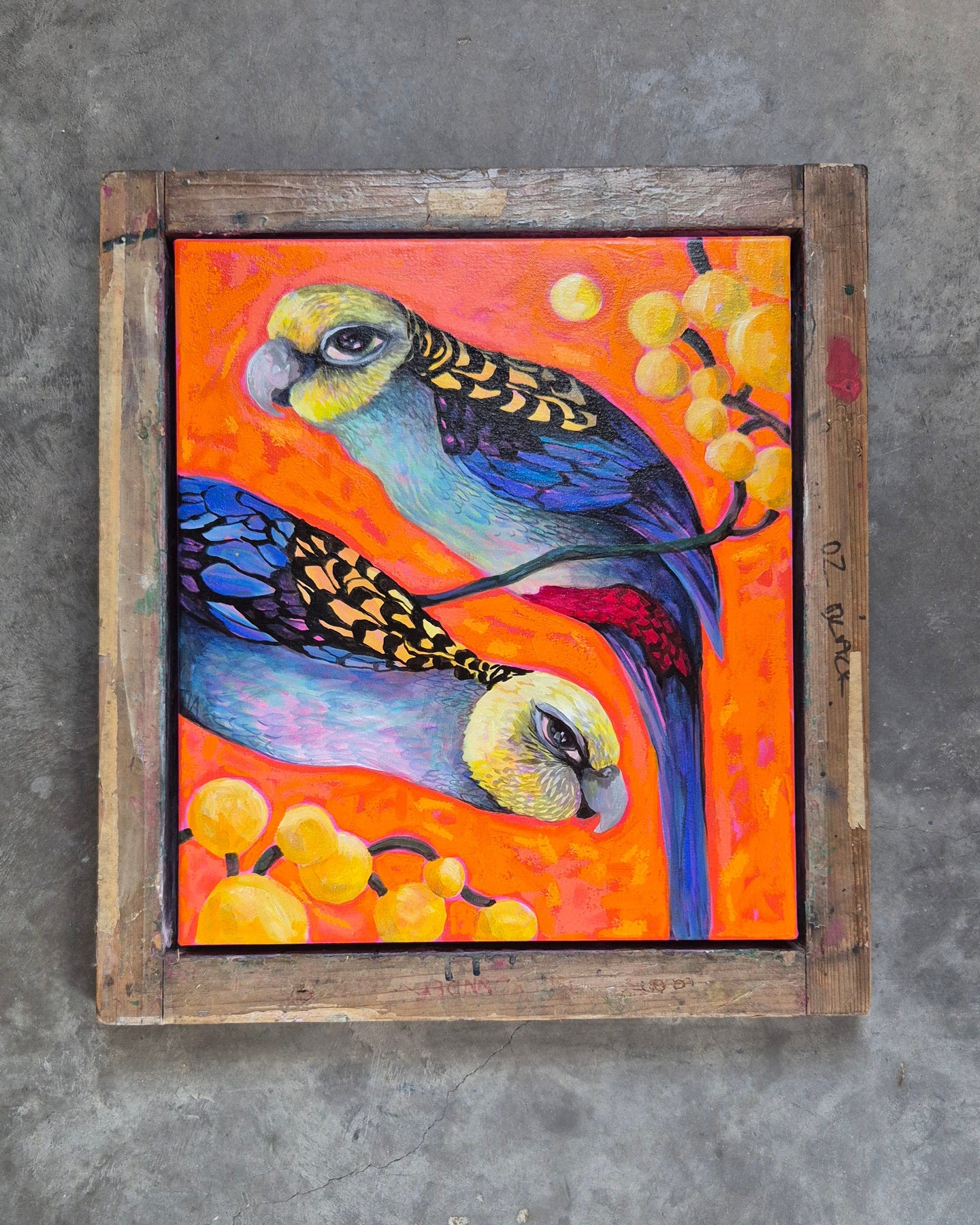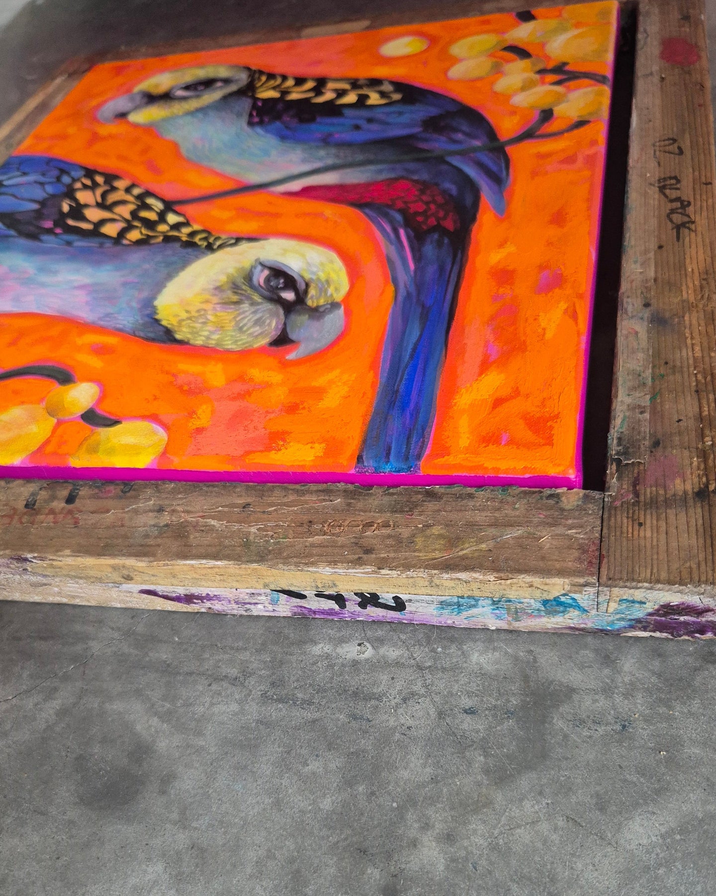 "Vibrant orange colour, yellow wattle and two Pale head rosellas combine in this work to represent joy and aliveness, playfulness and a zest for life. It is a reminder to never stop playing."