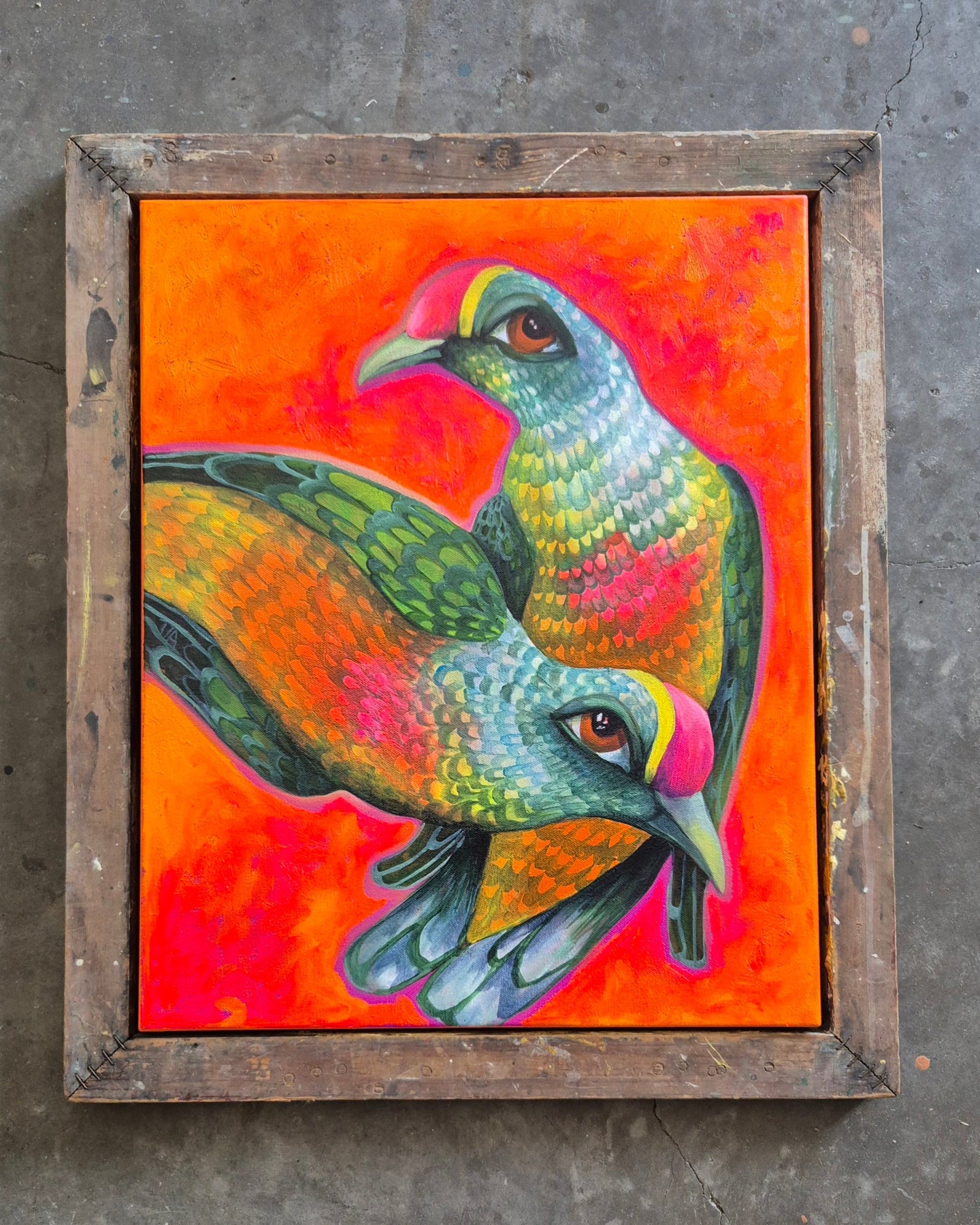 "Spiritual nourishers, this pair of Rose crowned fruit doves are a vivid depiction of the vitality they posess, through their brilliant colours, and that which they share with the world, as seed dispersers. This painting is a reminder of your own vitality and the abillity is has to make change, one little seed at a time."