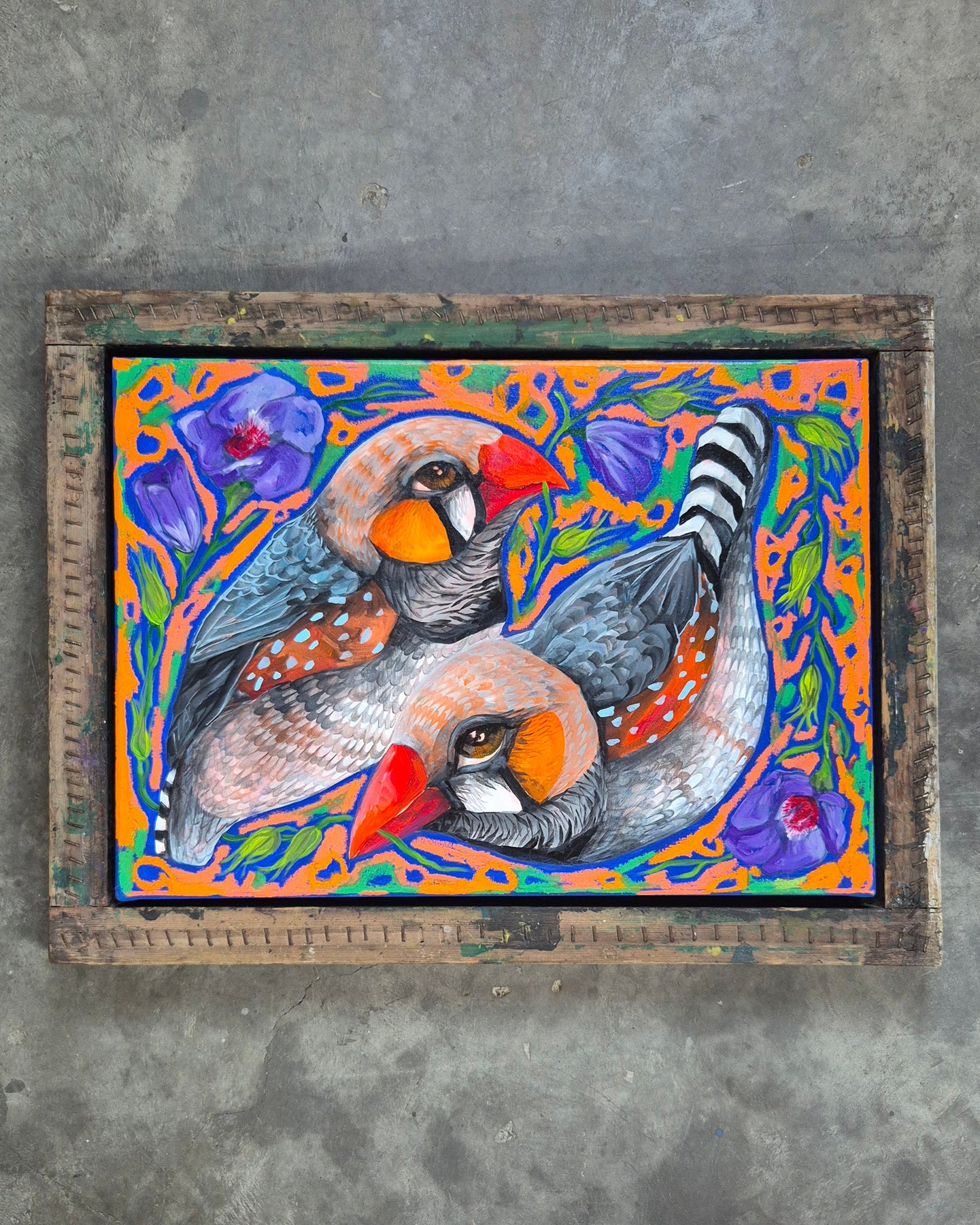 "Zebra finches, symbolic of delicate brilliance and small joys, and native hibiscus, a beautifully delicate and hardy flower that shows you can be both strong and soft at once."