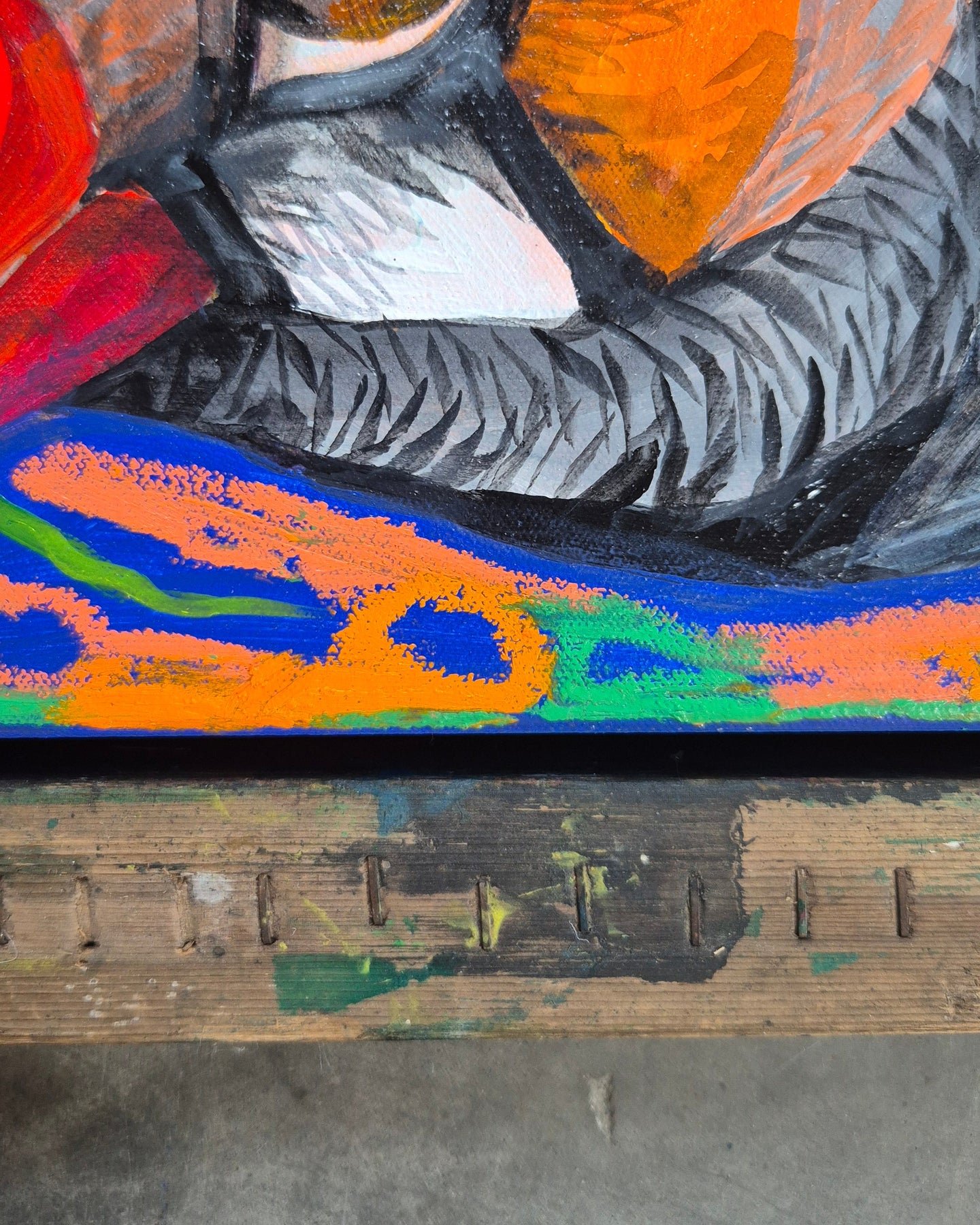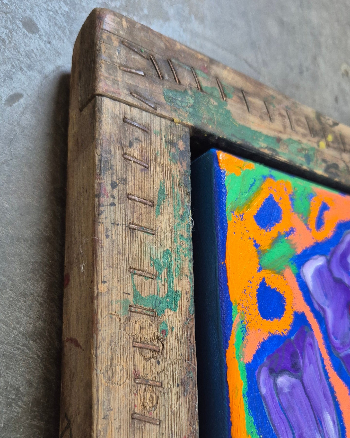 Acrylic and oil stick on cotton canvas, framed in a vintage screen print frame - ready to hang, d-rings.
